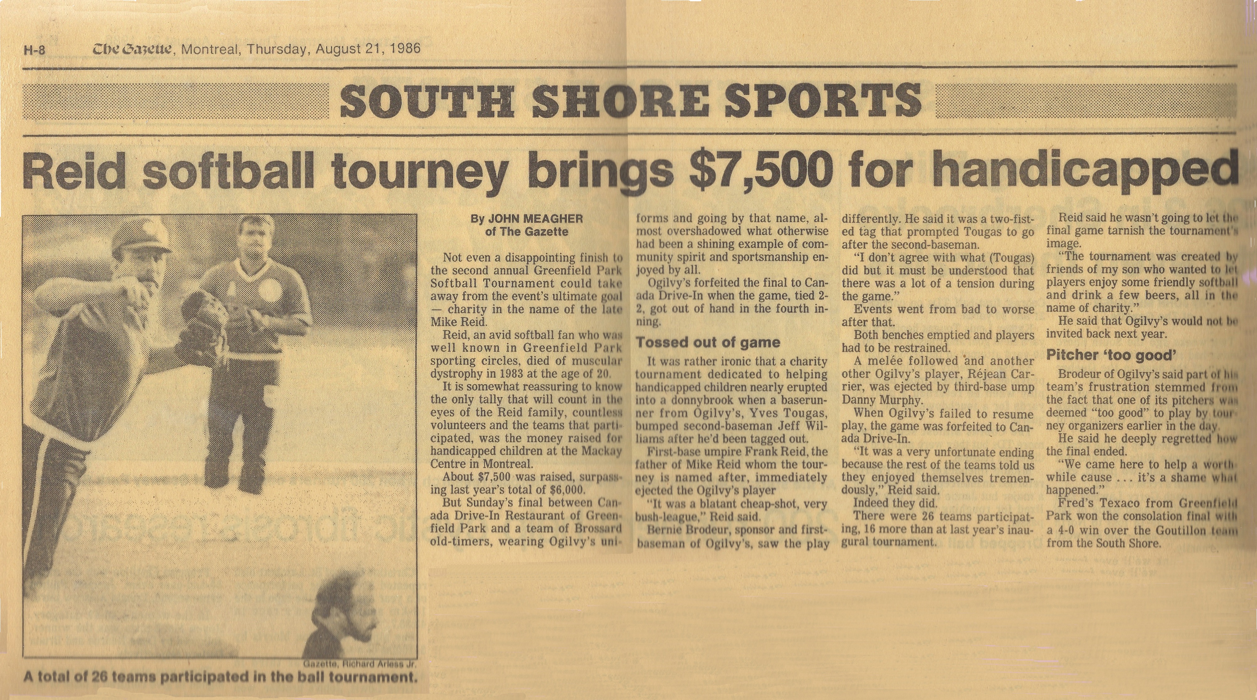 The team from Canada Drive-In defeated the Ogilvy's old-timers from Brossard. Fred Dobson's Texaco team from Greenfield Park won the consolation final with a 4-0 win over the Goutillon team from the South Shore. A total of $7,500 was raised for Montreal's MacKay Centre School.
